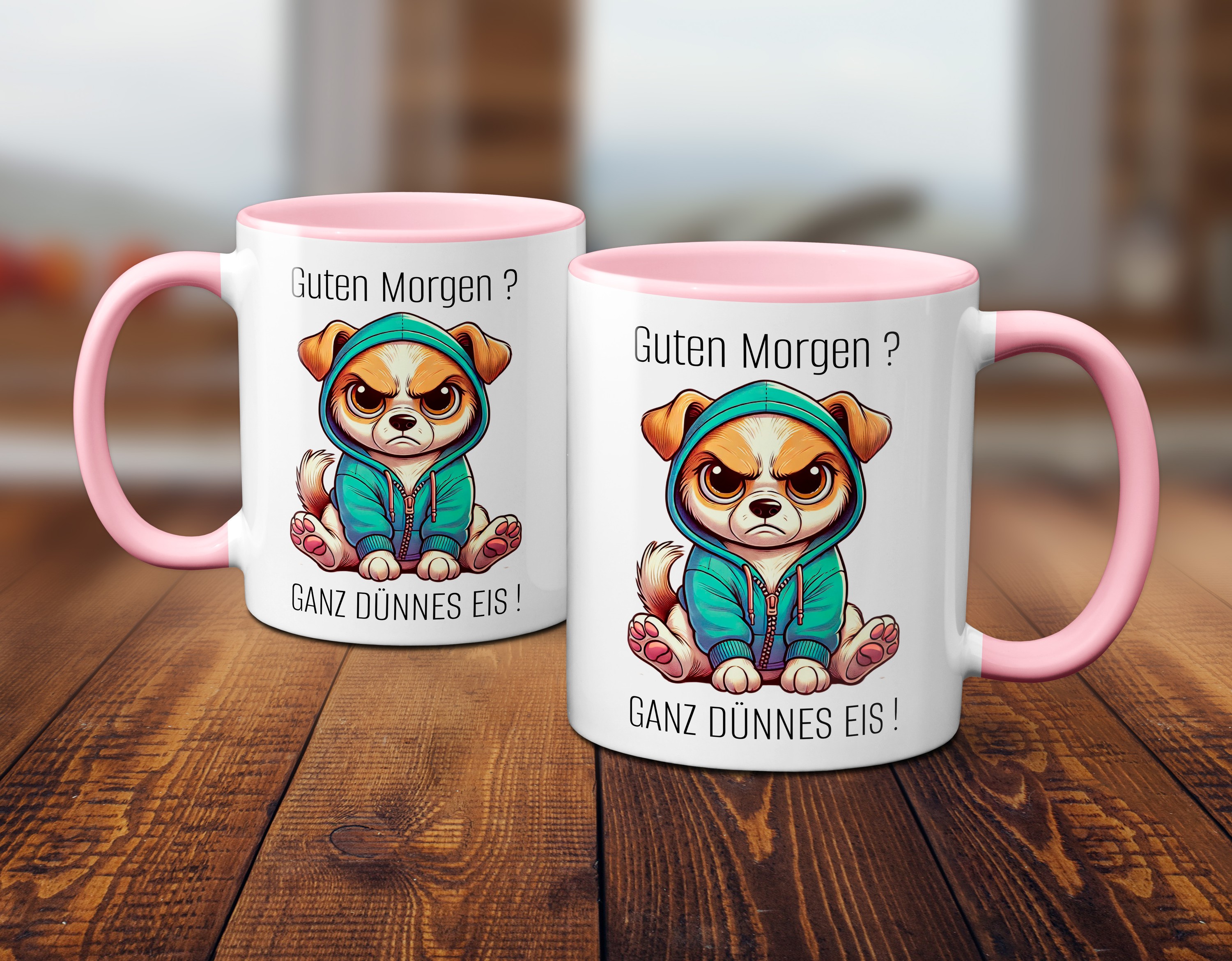 - Auffälliges Design: Kaffeetasse mit süßem Hund und Spruch - Guten Morgen? Ganz dünnes Eis! sorgt für Aufsehen und bringt dich zum Schmunzeln – egal ob im Büro oder zu Hause.
