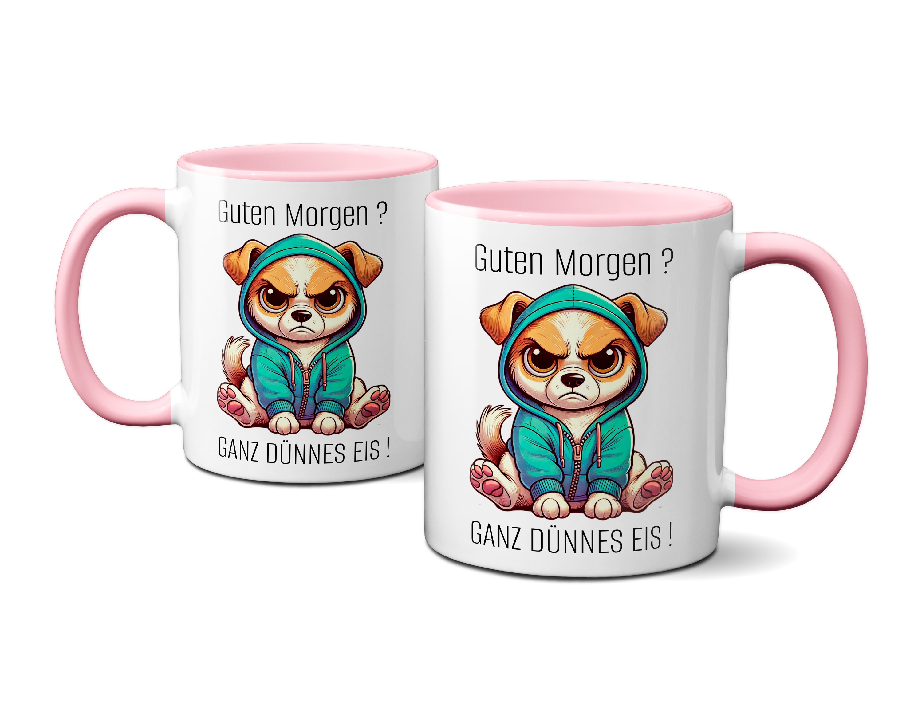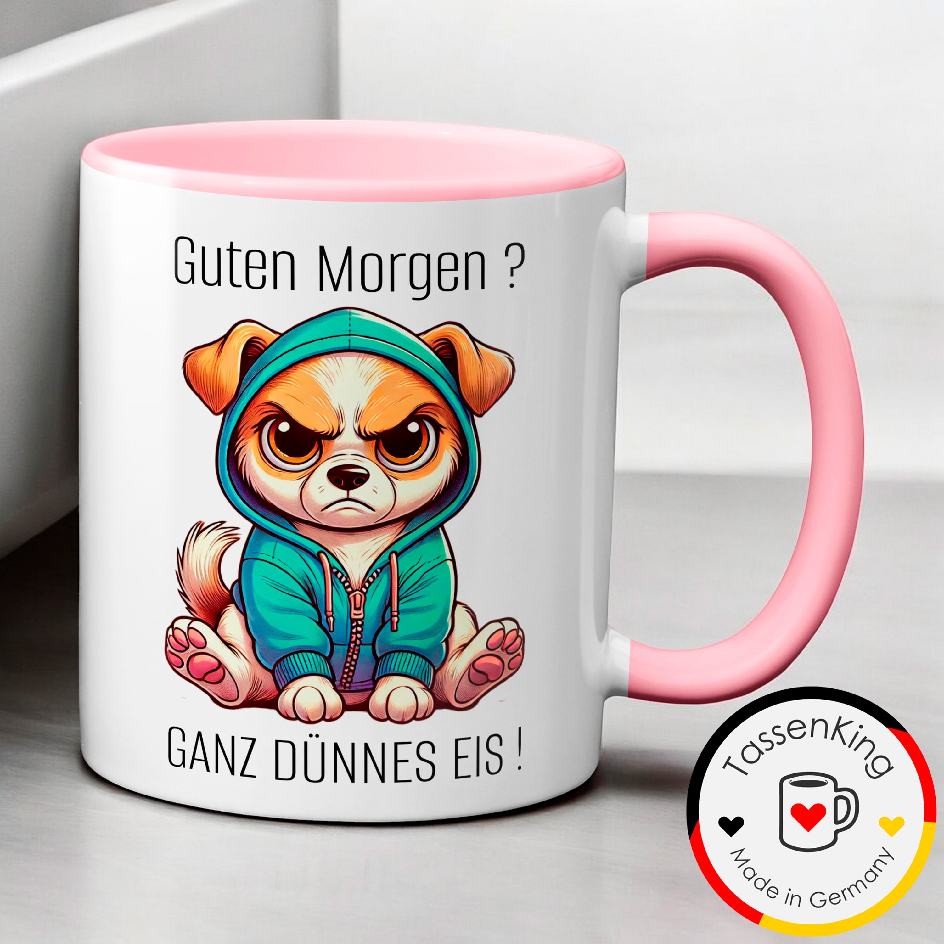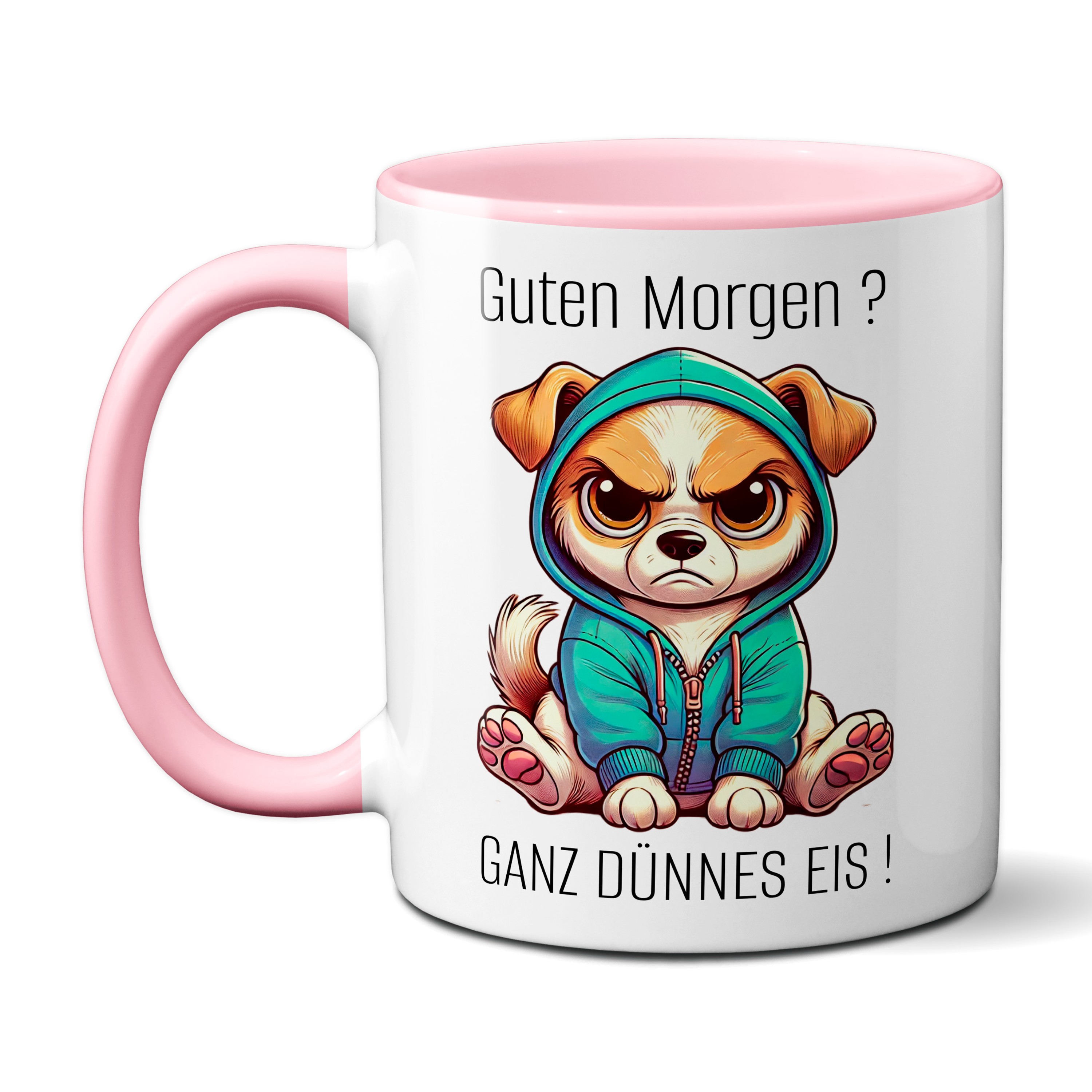 Kaffeetasse mit süßem Hund und Spruch - Guten Morgen? Ganz dünnes Eis! - Geschenk für alle Tierliebhaber und Kaffeegenießer