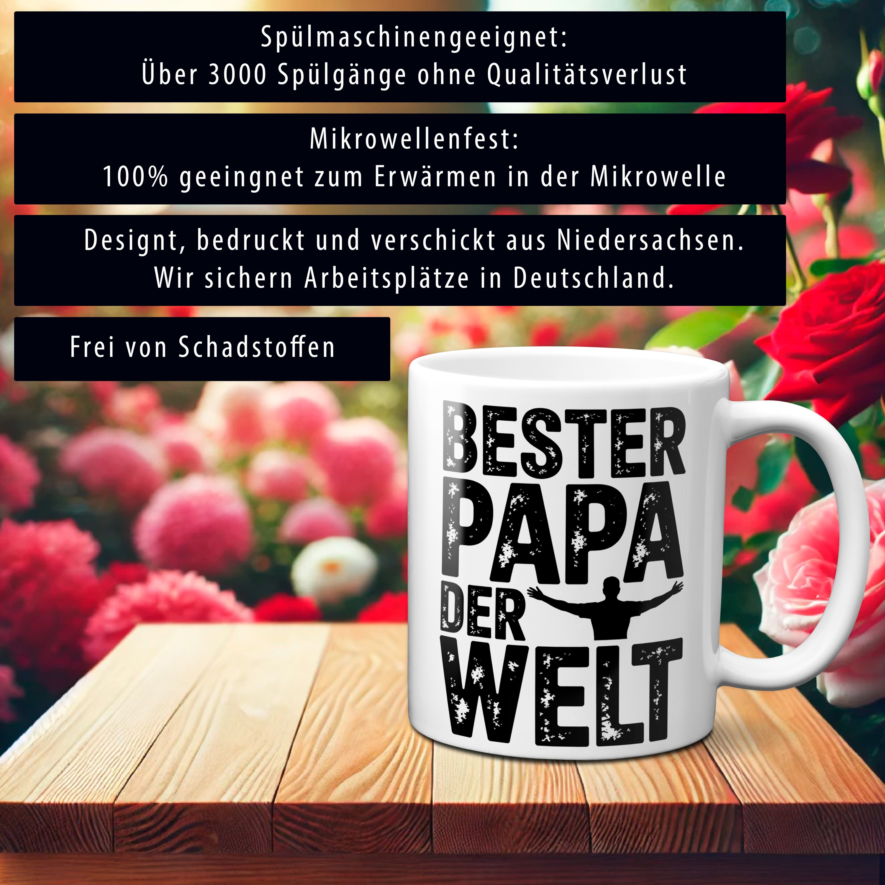 Die liebevoll gestaltete Aufschrift „Bester Papa der Welt“ macht diese Tasse zu einem idealen Geschenk für Väter – zum Geburtstag, Vatertag oder einfach als kleine Anerkennung zwischendurch. Der hochwertige Druck bleibt auch bei regelmäßiger Nutzung gestochen scharf und farbecht.